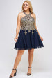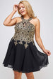 Discover effortless elegance in this plus-size halter party dress, featuring luxurious chiffon fabric that flows beautifully with every movement. Adorned with shimmering gold embroidery, the design captures light and attention in equal measure. The graceful flared silhouette flatters your figure while the built-in tulle lining provides structure and comfort underneath. Ideal for weddings, galas, and formal celebrations, this dress combines refined sophistication with wearable luxury. Step into the spotlight feeling confident, radiant, and utterly unforgettable.