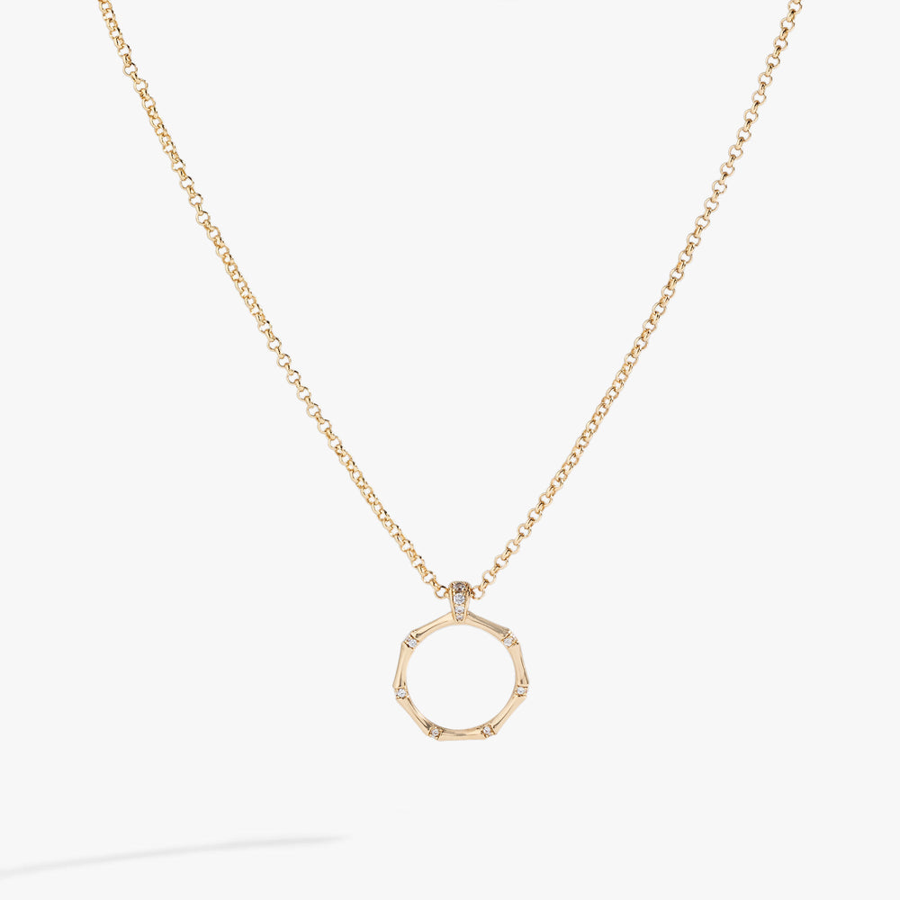 A symbol of strength and flexibility, bamboo is the ultimate vacation accessory. The Bamboo Pendant Necklace features a shiny gold chain with a pave crystal-detailed bamboo pendant ring.