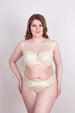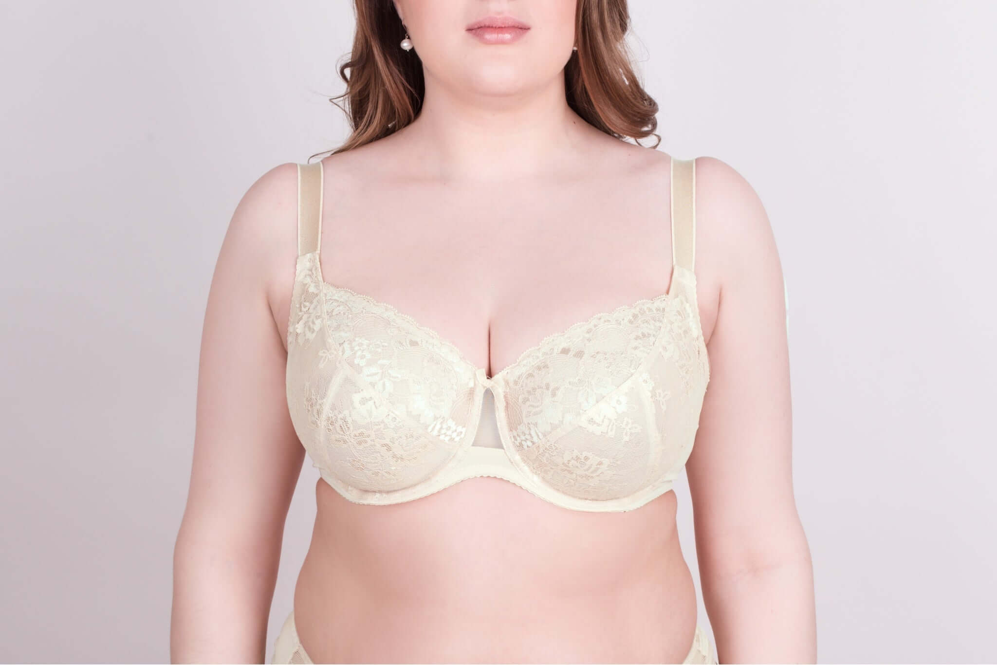 A classic bra made from non-elastic lace fabric and elastic knit fabric. The model is underwired, with soft cups featuring triple diagonal segmentation, and lined with mesh fabric. A decorative transparent insert on the central part of the bra, embellished with bows. Closure with 2 hooks in 4 rows, allowing for easy fastening and ensuring comfort and a beautiful fit.