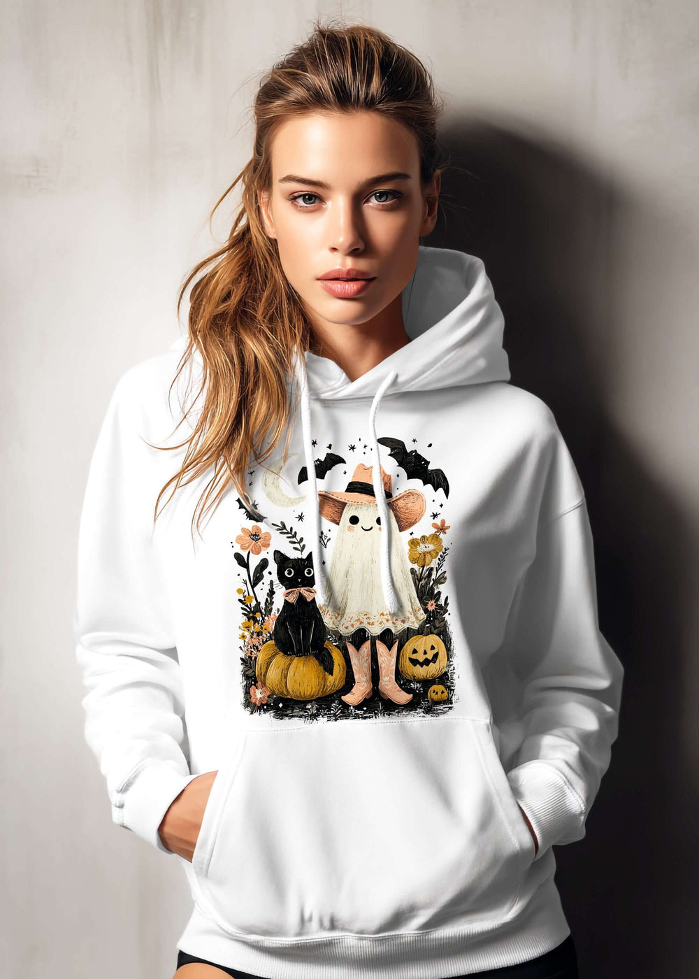 Get cozy and spooky in style with our Halloween Western Ghost with Black Cats Hoodie! This one-of-a-kind design brings together a ghostly cowboy and his mischievous black cat crew for the ultimate mix of Western charm and Halloween magic.