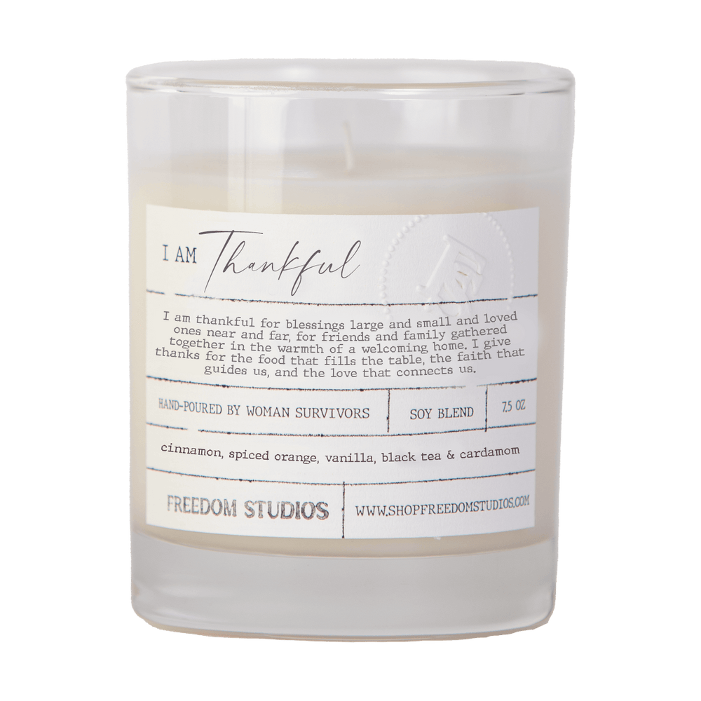 This 7.5 oz glass candle is made with soy blend wax and clean-burning cotton wicks and fragrances. Each candle is hand-poured by women survivors and comes in a cotton bag.
