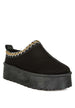 Introducing our chunky platform sliders-where warmth meets chic design. With convenient pull tabs and decorative embroidery detail on the collar, these closed round-toed flatform sliders are great when curling up at home, running errands, or simply out and about.