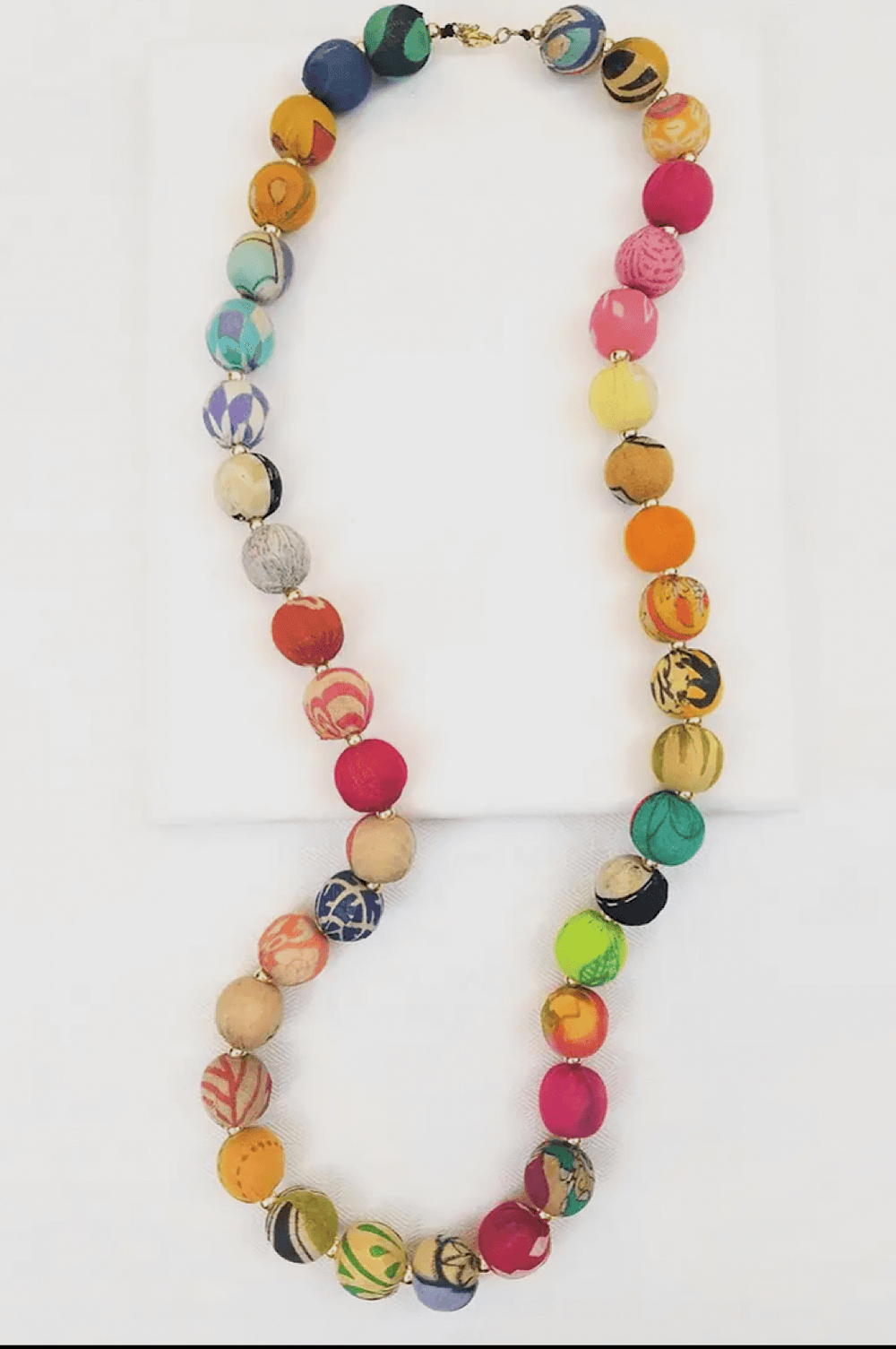Long single strand multi-color bead necklace - artisan fair trade jewelry with vibrant Kantha fabric beads perfect for bohemian style, ethical fashion, and colorful accessories. High quality artisan jewelry made metal plating with a polished smooth finish. Nickel free and lead free materials. Handcrafted with intricate techniques resulting in beautiful yet durable jewelry pieces. Artistic bohemian style jewelry that you will enjoy wearing with a wide variety of outfits in various colors. Necklace has additional 4 inches with the extender chain that is connected to the lobster claw and chain closure.
