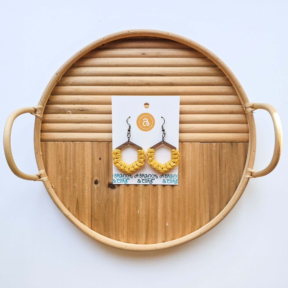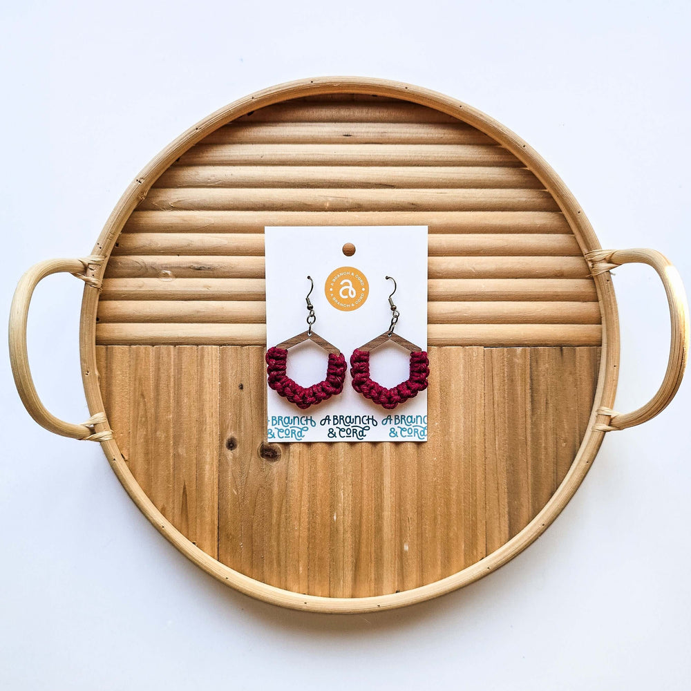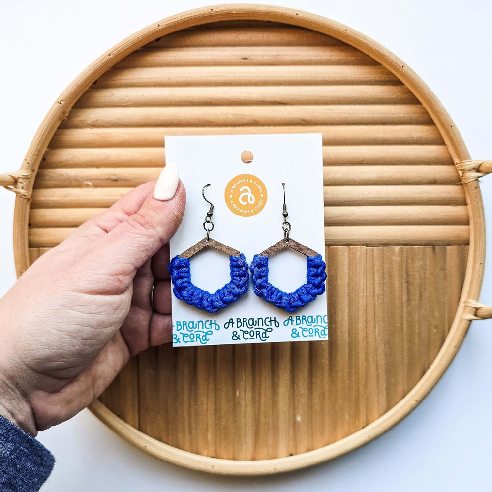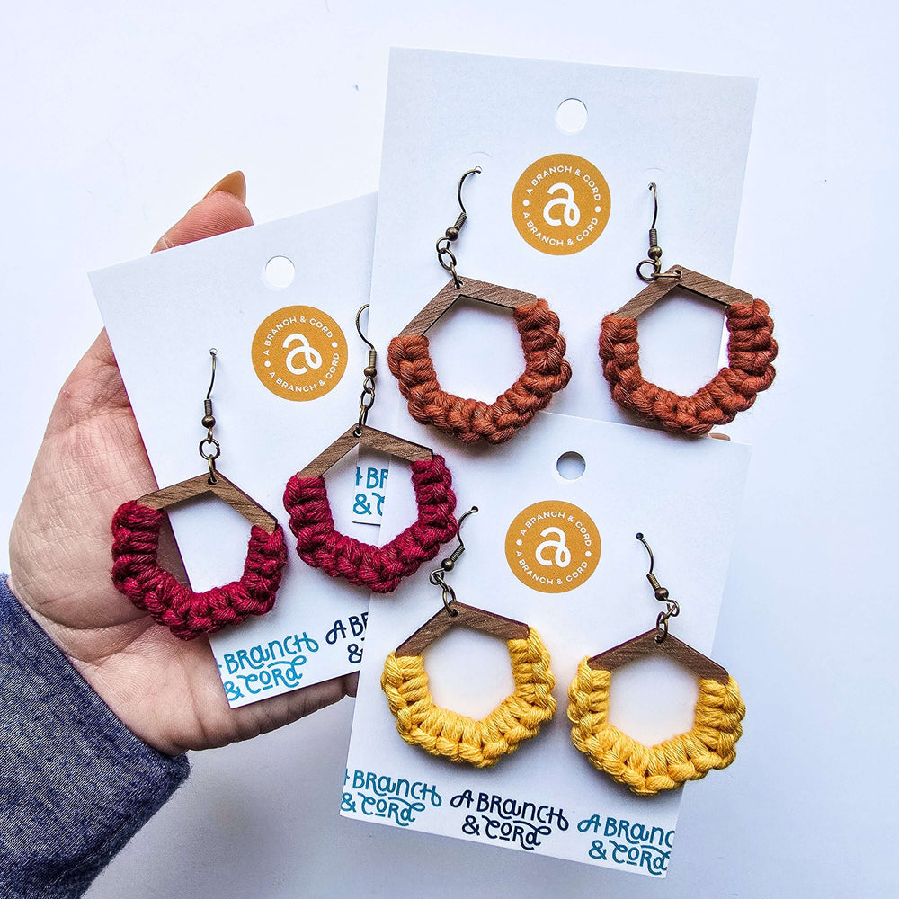 Handmade with 100% cotton cord, wooden earring blanks, and bronze, hypoallergenic earring hooks.