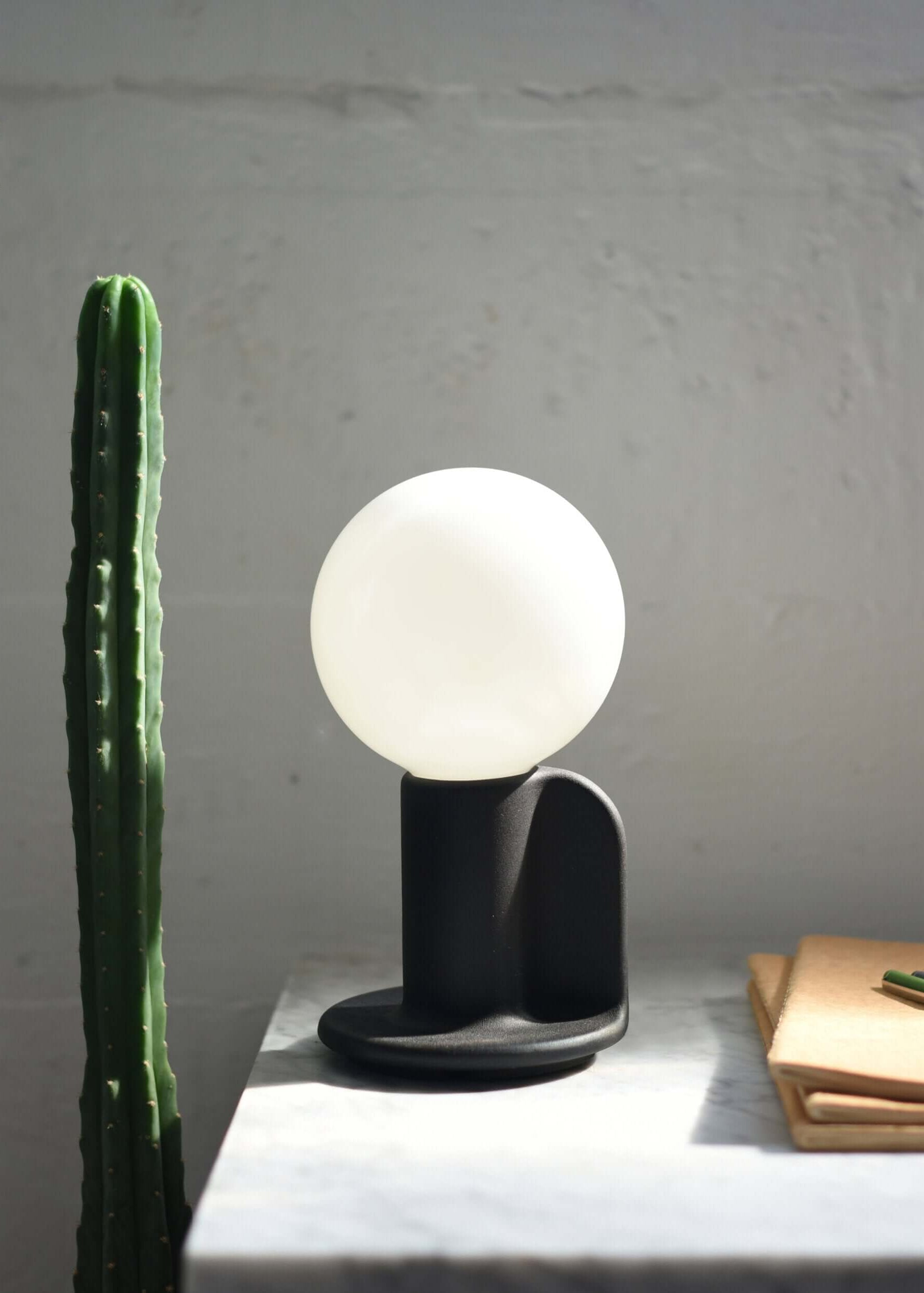 The Q Lamp is a compact lamp inspired by the charm of historic candle trays. The lamp body is handmade (by Maker Goods) of glazed ceramic and features a generous paddle for repositioning. The lamp is just under ten inches tall and was designed to fit neatly on bookshelves, desks and occasional tables. The lamp comes with a mouth blown, sand blasted light bulb designed by Tala, a British lighting brand dedicated to sustainability and unique design.