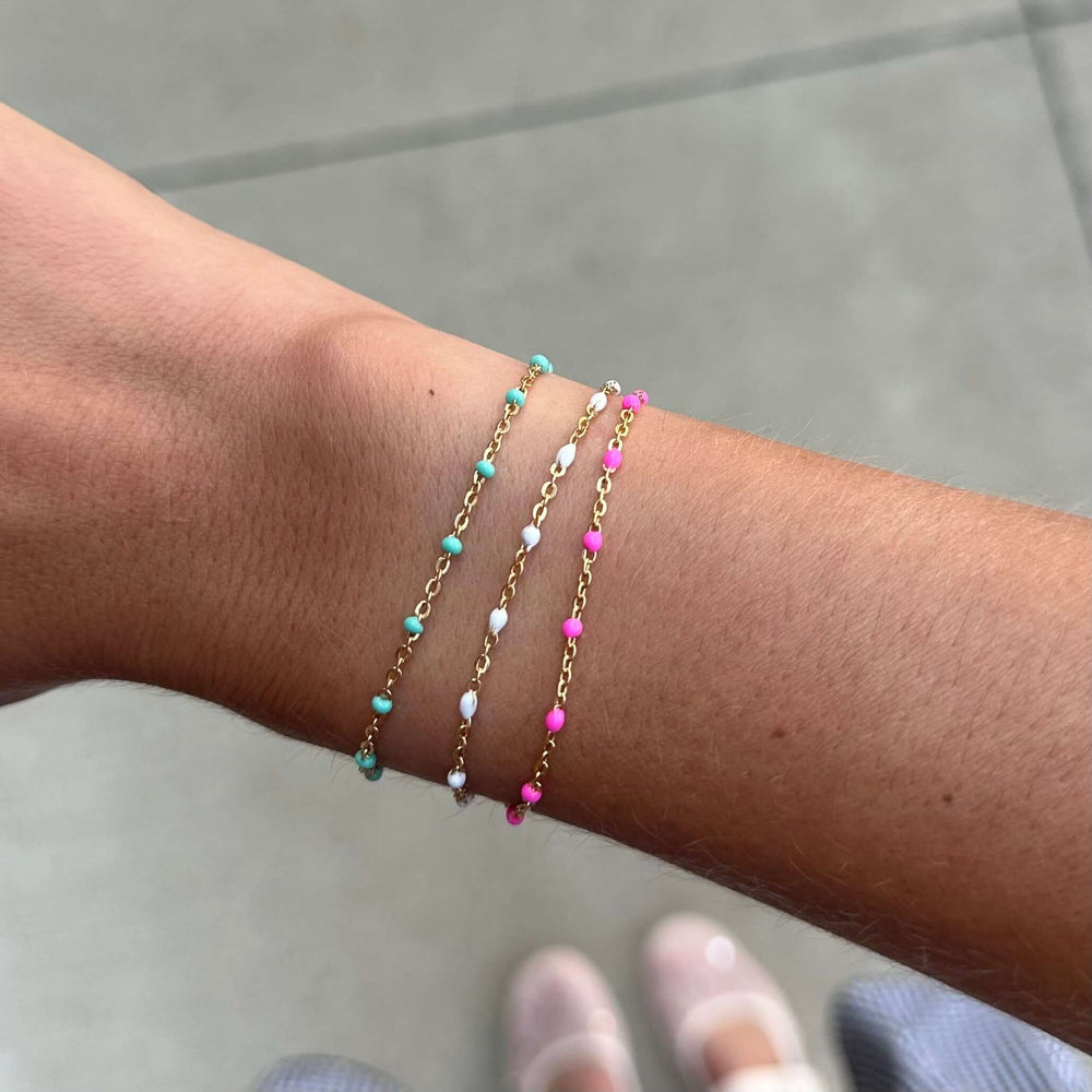 Colorful daisy flower bracelet set - three stackable bracelets in turquoise, pink, and white with daisy charms perfect for spring fashion, festival style, and boho jewelry. For our colorful daisy bracelet lovers, the ultimate cute colorful stack! Our turquoise, pink, and white daisy bracelets stacked together. 14k gold filled chain. Save 5% when you purchase as a stack. Handmade in the USA. This vibrant bracelet stack features flower power designs and cheerful colors. Ideal gift for flower lovers, free spirits, and summer style. Shop floral bracelets, stackable jewelry, and bohemian accessories.
